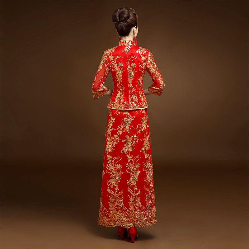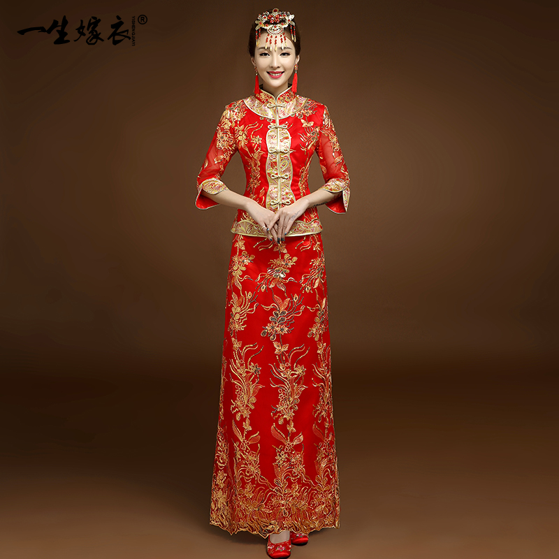 新娘敬酒服旗袍秀禾服2017新款中式婚纱礼服红色长款新娘结婚