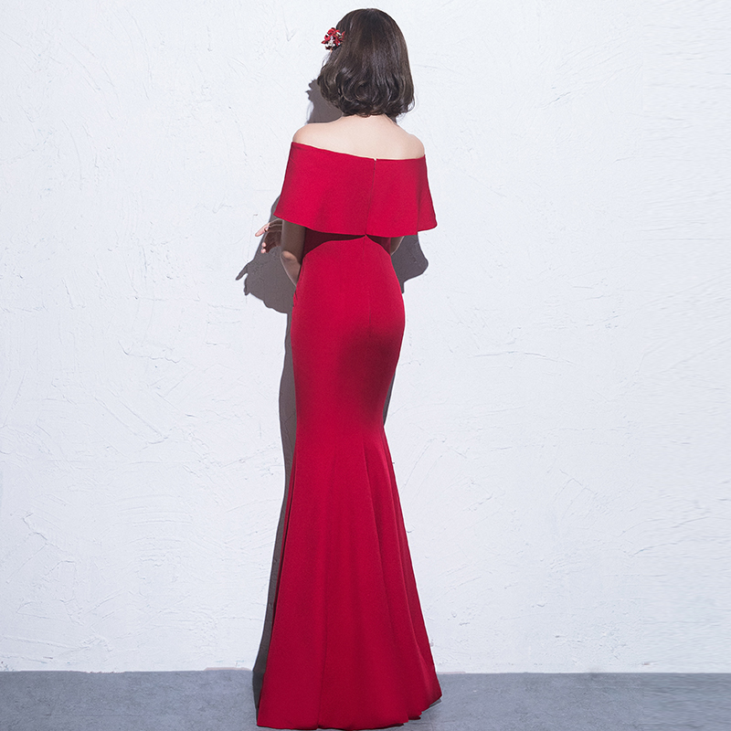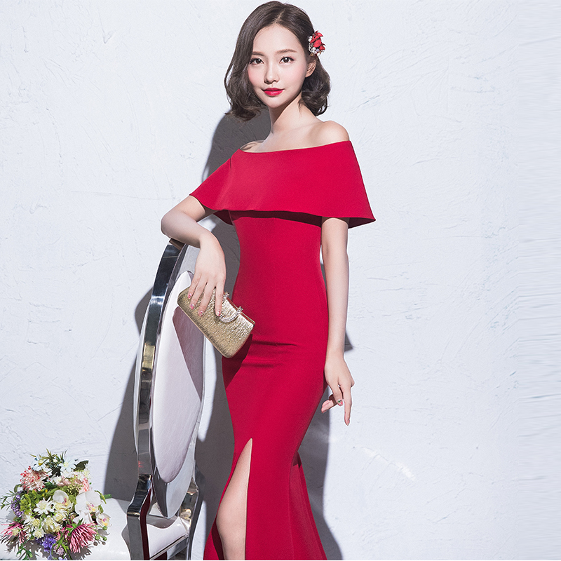• 新娘敬酒服2017新款性感一字肩酒红色修身长款结婚晚礼服女