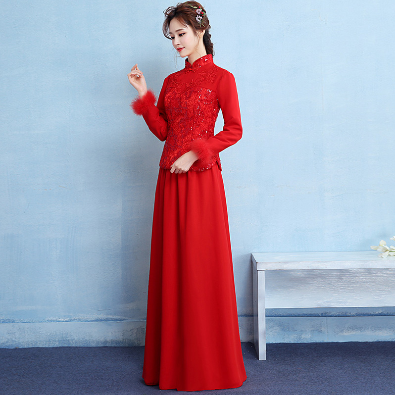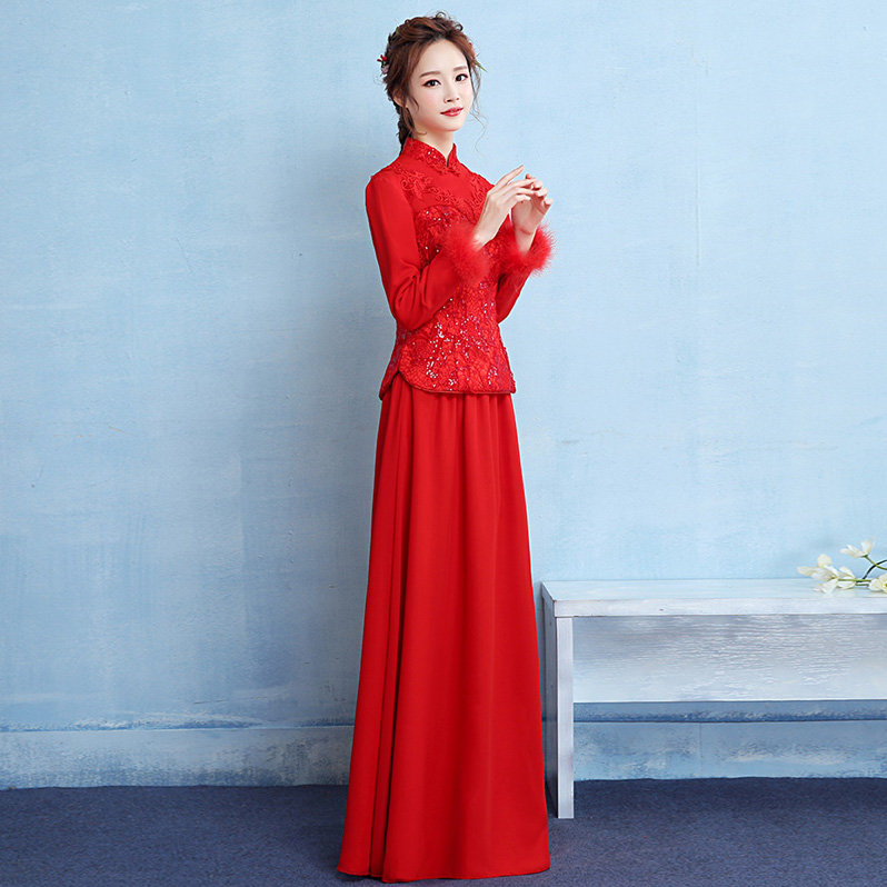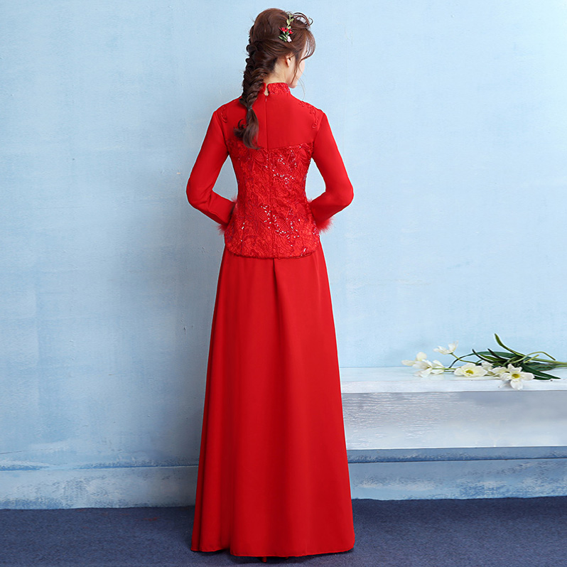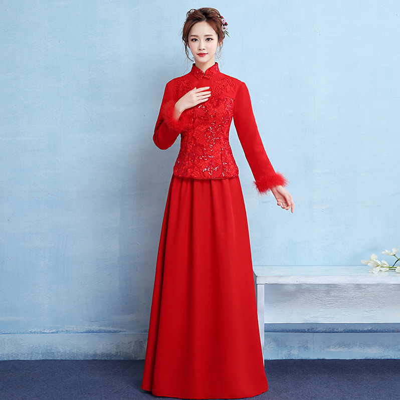 • 加厚保暖!新娘敬酒服旗袍新款冬季长袖长款中式红色结婚礼