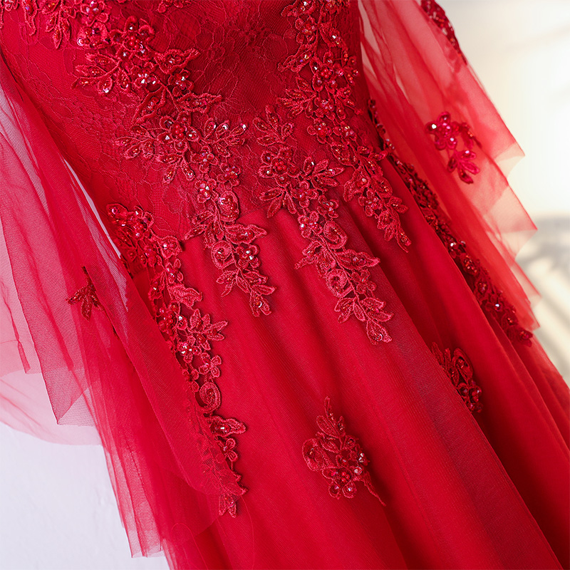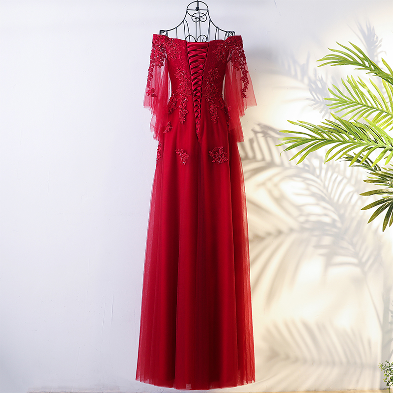 • 新娘敬酒服2017新款酒红色时尚一字肩v领长款大码显瘦结婚回