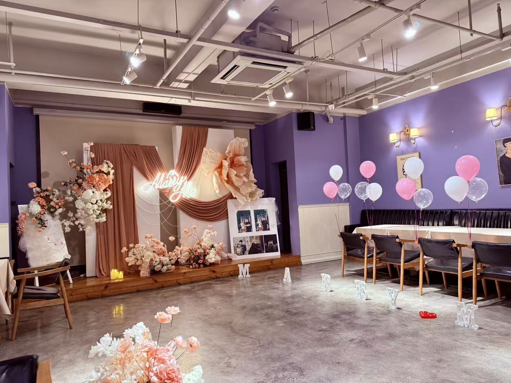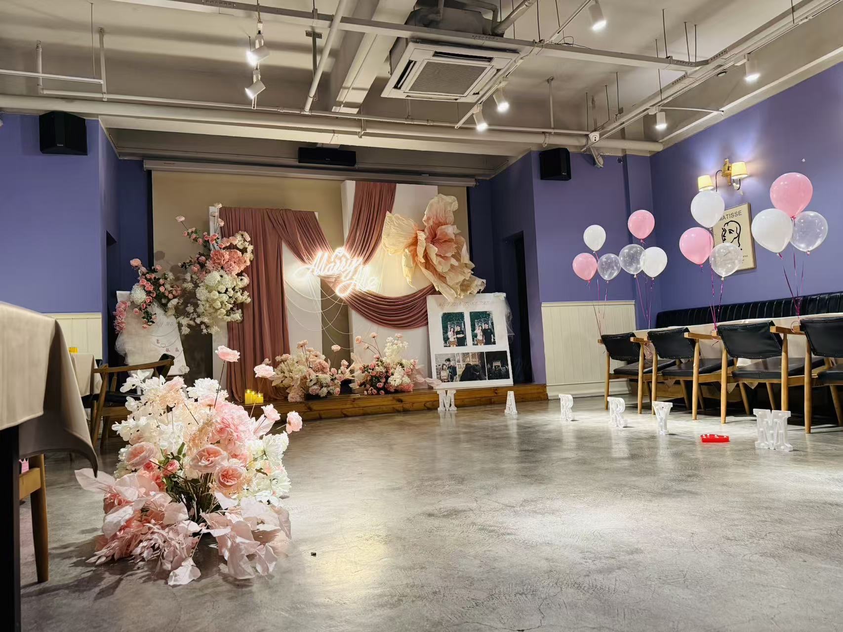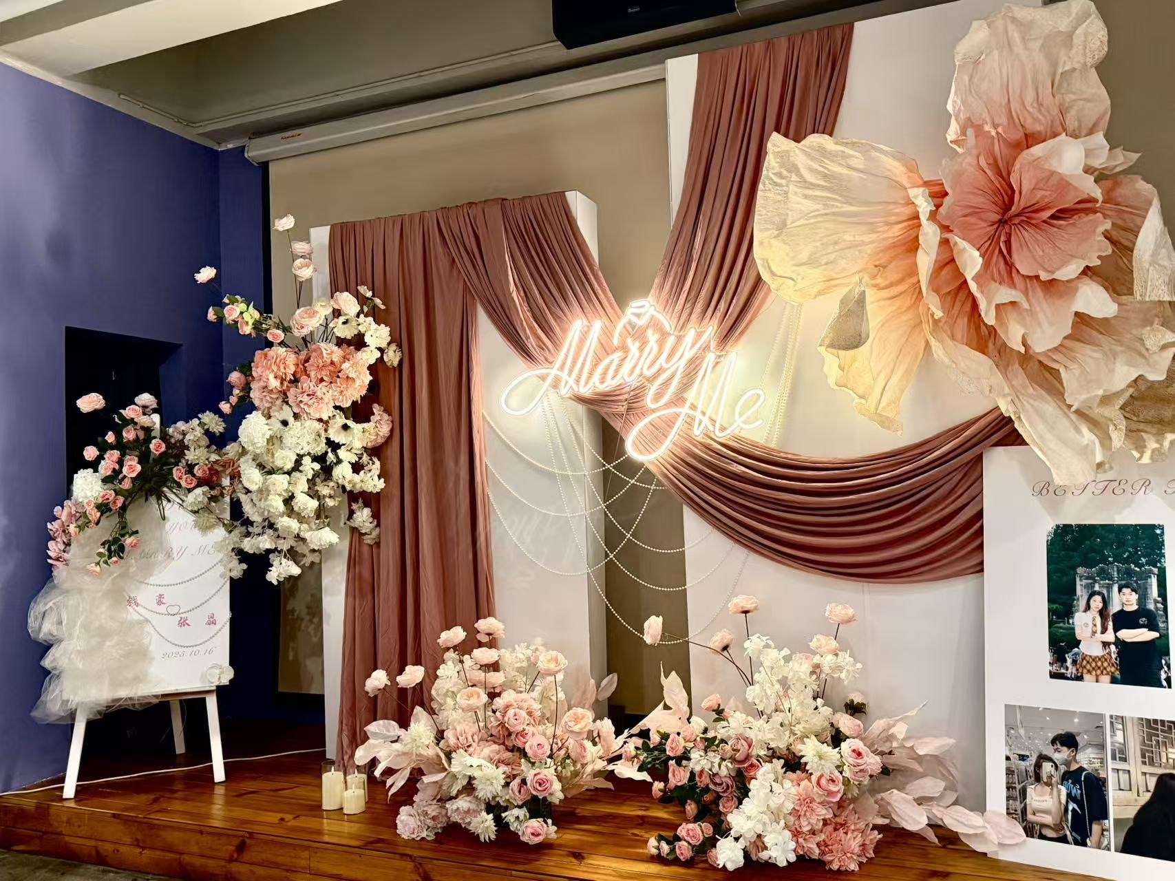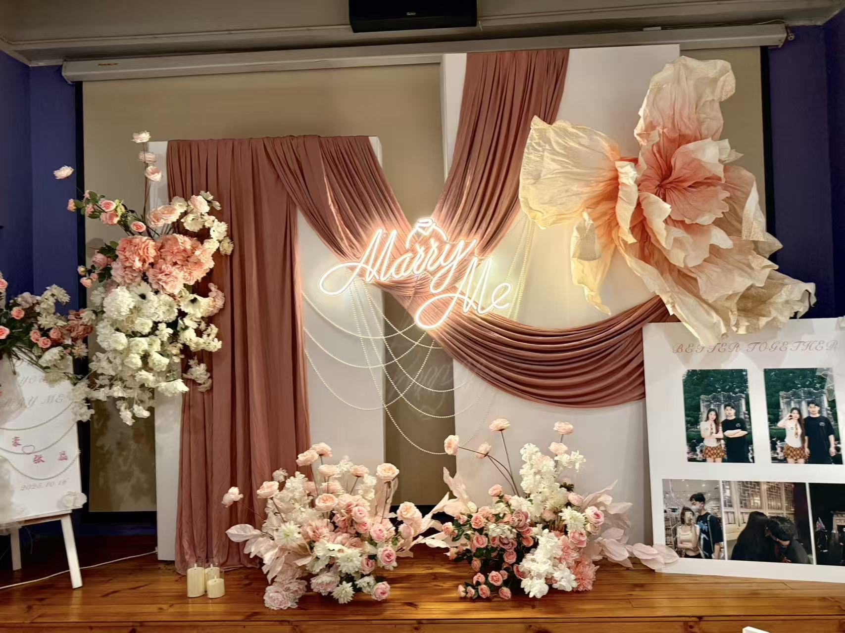 在这片浪漫空间里,暖棕帷幔与柔粉花艺交织,“Marry Me”霓虹闪烁如爱的星光。气球轻舞,照片定格甜蜜瞬间,每一处布置都藏着心动细节,将仪式感拉满,让求婚时刻成为永恒的浪漫秘境。