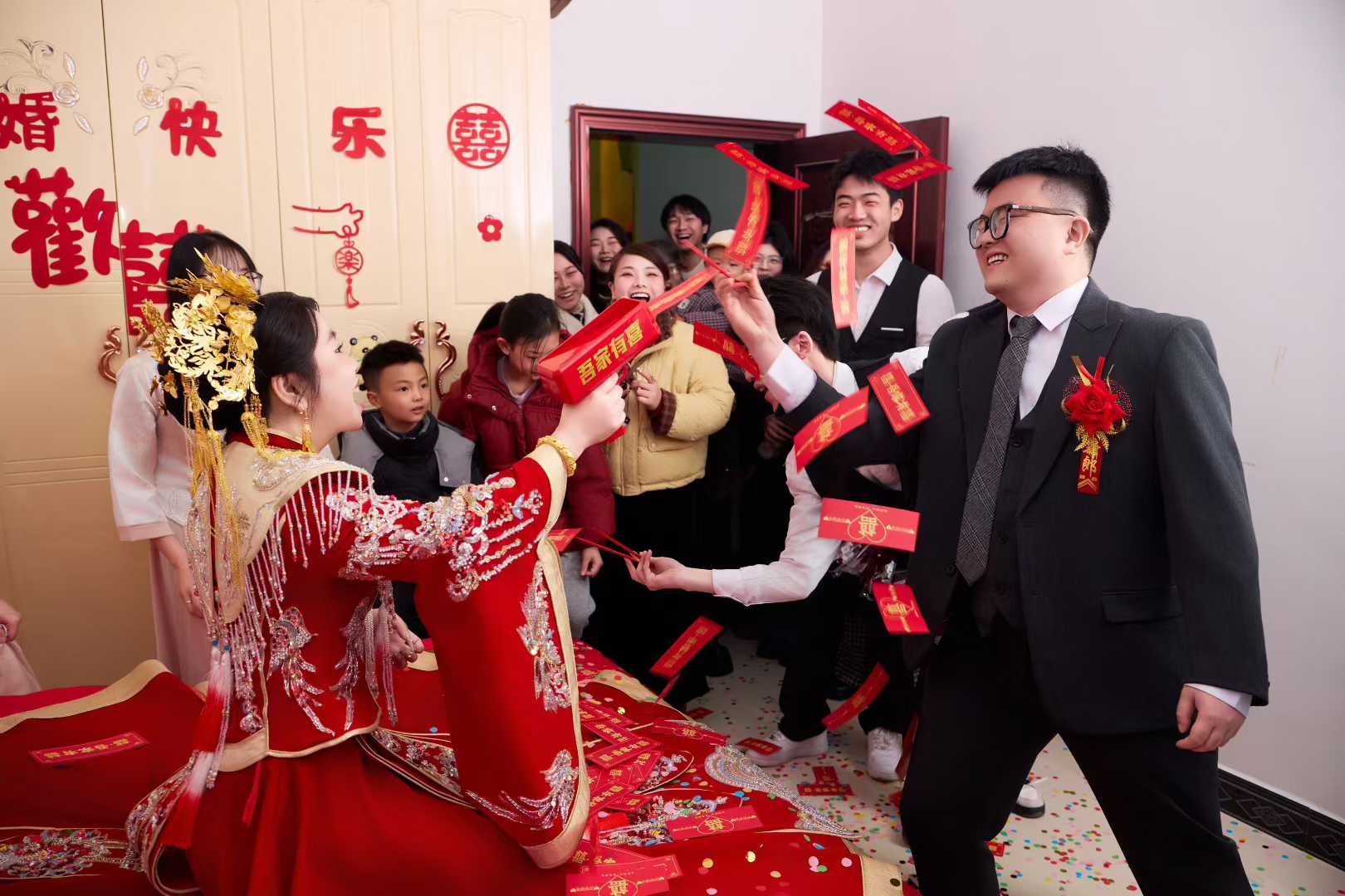 新人小姐姐婚礼不穿婚纱,直接定了我们重工秀禾 敬酒服 新郎西服组成888套餐,实惠又好看,婚礼也很出片,效果也棒棒的。