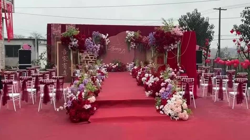 红花映衬的户外婚礼